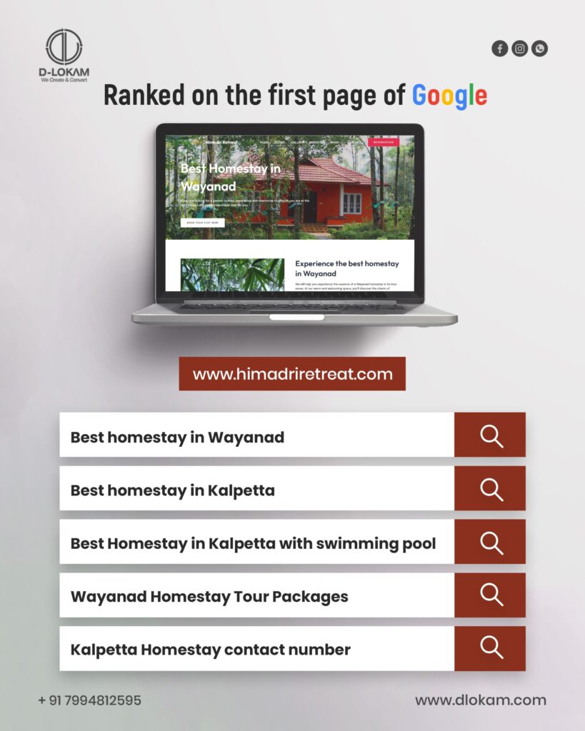 This pushed local-intent keywords like “Kalpetta homestay contact number” to the first page.